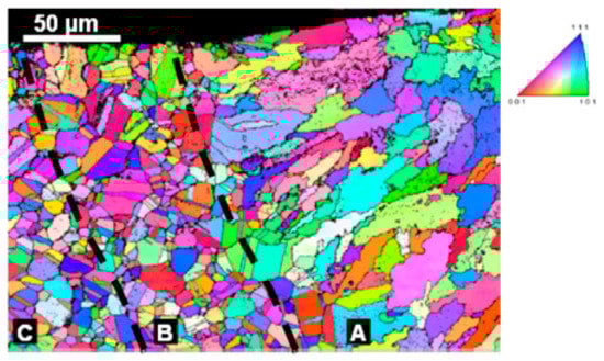 Inverse pole figure of the cross-section of the as-built IN625 track. A represents the track, B represents the heat-affected zone, and C represents the substrate [].