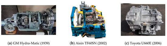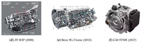 Many synthesis methods for EGTs have been proposed so far and subsequently different configurations have been obtained, which are helpful for the innovation of ATs. Up to now, a wide variety of ATs have been proposed, analyzed and produced. In 1939, the Hydra-Matic was invented through the combination of a hydraulic coupling with a three-row EGT, and it was installed on GM Oldsmobile cars [23]. The Hydra-Matic could achieve four forward gears and one reverse gear so that it was considered as the symbol of ATs at that era. Since then, the ATs have rapidly developed. In 1950, Ford company developed a three-gear AT equipped with the torque converter, representing that the AT technology enters the maturity stage. In 1965, AP company produced the first AT installed on the front engine and front drive (FF) vehicles, which promoted the miniaturization of ATs [24]. Then, originating from the fuel crisis in 1970s, ATs with more gears and smaller volumes were designed. The four-gear ATs with an over-speed gear were developed in this regard in 1977. In 1989, five-gear ATs were invented, while 6-gear ATs appeared at the end of the 20th century [25]. Nowadays, ATs with 6–8 gears are mainstream products, while the nine-gear ATs have been developed and applied in some products. Moreover, hybrid transmission systems are studied increasingly common, which are expected to solve the problem of fuel consumption [26,27,28]. Reviewing the literature indicates that ATs are developed towards more gears, lightweight structure, higher efficiency, and mechanical electronicalization. Figure 1 shows some typical AT products to illustrate the trend.