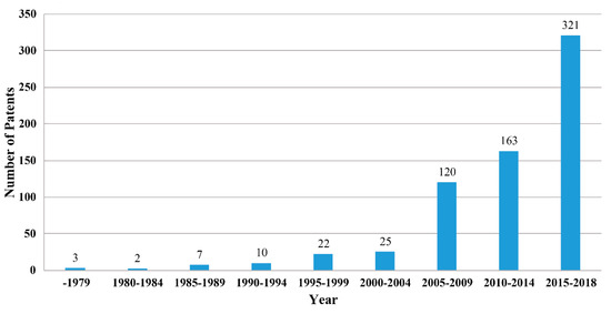 Number of annually published patents. Note: The value on the bar graph represents the number of published AT patents in the respective year intervals.