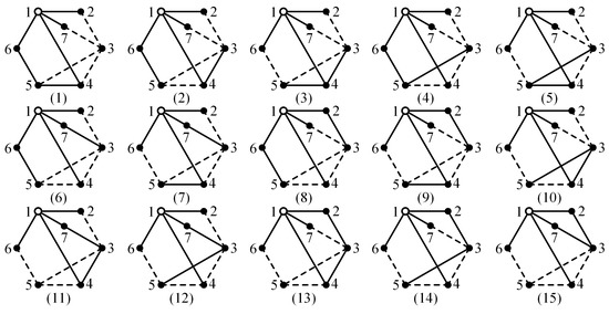 (5) Obtain DBGs from the basic graphs. There are 14 lines in the basic graph, where 9 of them can be transformed into dash lines. Therefore, there would be 84 (i.e., ) DBGs. Excluding the DBGs inconsistent with the structural characteristics (2)–(9) and considering the isomorphism problem, there are nine DBGs left. Table 16 shows the remained DBGs. By adding several clutches as appropriate, new configurations can be obtained to use for ATs.