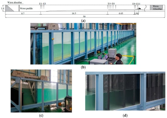 The experiment was conducted in a wave flume located at the Korea Institute of Ocean Science and Technology (KIOST) in Busan, Republic of Korea. The dimensions of the wave flume are 50 m in length, 1.2 m in width, and 1.6 m in depth [12]. The wave flume is equipped with a piston-type wave maker developed by VTI (Vazquezy Torres Ingenieria, Spain) Corporation. The wave maker can generate a regular wave, an irregular wave, and a solitary wave. The wave paddle is made of stainless steel and glass fiber reinforced plastic. To reduce re-reflected waves at the wave paddle, an active absorption system was applied to the wave generation software (AwaSys 7), based on the digital filtering of signals from the wave gauges in the nearfield [13,14]. Passive wave absorbers were placed to absorb wave energy at both ends of the wave flume. As shown in Figure 2a, 11 wave gauges (Equations (1)–(11)) were placed, and the model structure made of acrylic plates was placed 32.13 m from the left end of the wave flume. Without the model structure, the wave gauges from Equations (9) to (11) are used to analyze the incident wave heights of the target waves. The distance between Equations (9) and (10) is 0.3 m, and the distance between Equations (10) and (11) is 0.5 m.