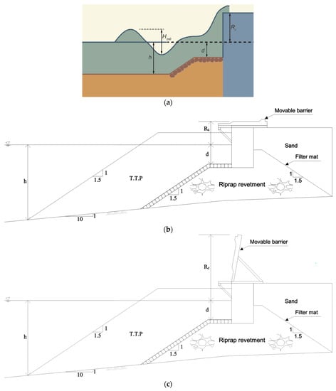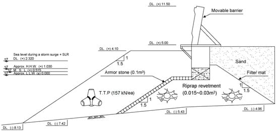 Figure 3 shows a conceptual design for the movable barrier on the revetment of Haeundae Marine City in Busan, Republic of Korea. The height of the movable barrier was designed to be 6.5 m. In a normal state, during which the movable barrier does not stand, the designed sea level is the approximate highest high water (Approx. H.H.W.). Under an abnormal state activating the movable barrier, the designed sea level is considered to be the storm surge height and the sea level rise (SLR). In this study, a 1/36 scale model was adopted to consider the bathymetry in the wave flume. The similitude ratio for the Froude similarity was then scaled down. At this scale, the weight of the tetrapod (T.T.P) was 3.051 N per each. T.T.Ps were randomly placed (considering those placed on the target site) for all experiments.