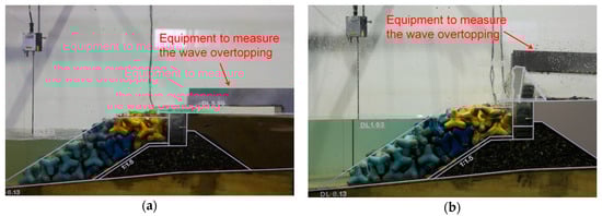 Photographs of the overtopping water for the maximum water surface elevation; (a) non-standing barrier for the 10-year return period and the approx. H.H.W. (No. 1, Table 2); (b) standing barrier for the 50-year return period and the sea level during the storm surge with the SLR (No. 4, Table 2).