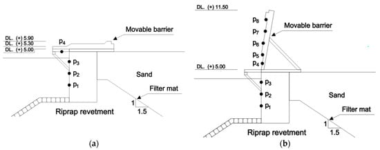 The first purpose of the experiments was to measure the discharge of the wave overtopping. Thus, a waterway was placed on top of the movable barrier, as shown in Figure 4. A water trap was installed behind the model to capture the overtopped waters during the experiment. In the water trap, a flowmeter (Manufacturer: NTON INTERNATIONAL, China; Model: K24 turbine digital oil fuel flow meter gauge for chemicals liquid water) was installed to detect the discharge of the wave overtopping. The measurement range was 0.01 to 0.12 m3/min, and the measurement accuracy was less than 1%. The discharge was measured and calculated during the full test time to be 30 min, corresponding to a full-scale time of 3 h. Figure 4 also shows the installed model structure in the wave flume. The model structure has been reproduced as similar as possible the design of the target site. The second purpose of this experiment was to measure the wave pressure and to determine the occurrences of impulsive wave pressures acting on the movable barrier, as shown in Figure 5. In order to characterize the wave pressure acting on the movable barrier, pressure measurements were taken at four points (p1 to p4) in a normal state and at eight points (p1 to p8) in an abnormal state. The pressure gauges use disk-type pressure transducers with 10 mm diameters. Table 1 shows the specification of the disk-type pressure transducer [15]. All pressure gauges were mounted at the digging holes in the desired locations of the model structure. To protect the pressure gauges from the impact of the armor unit, a safe guard was installed in front of the mounted pressure gauges. This safe guard is made of a thin perforated plate, which has large perforations to minimize the influence of the measured pressures. In Figure 5a, the locations of the 4 points, p1 to p4, from 0 m of the datum level (DL) are 1.03, 2.32, 3.61, and 4.70 m, respectively. Here, p4 was placed to measure the uplift pressure acting on the movable barrier in a normal state. In Figure 5b, the locations of the 8 points, p1 to p8, from 0 m of the datum level are 1.03, 2.32, 3.61, 4.70, 5.67, 6.62, 7.89, 9.20, and 10.46 m, respectively. Here, we placed p4 to p8 to measure the wave pressure acting on the movable barrier surface facing the outer sea in an abnormal state.