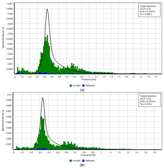 Test waves were generated several times to find values close to the target wave. Figure 6 shows two cases of the spectrum of test waves, since the other two cases had similar results. The solid line is the analytical solution, and the histogram shows the results of the experiment applying the method for separating the incident and reflected waves [17]. The peak enhancement factor γ is 3.3, and Tp is the wave period corresponding to the frequency fp at the spectral peak. The results of the experiment have a similar tendency with those of the analytical solution. For all cases, the maximum relative error of the significant wave height is about 0.66%, and the maximum relative error of the significant wave period is about 4.53%. In Figure 6, the green bar is the incident wave, and the blue bar is the reflected wave. The coefficient of wave reflection KR is in the range of 0.25 to 0.31. In the Harbor and fishery design criteria [22], the coefficient of the wave reflection for the natural beach is suggested to be in the range of 0.05 to 0.2. Thus, the results of the experiment are slightly higher than those of the natural beach. This implies that wave absorbers in the wave flume correctly absorb the wave energy. Table 2 shows a detailed test of the wave conditions.