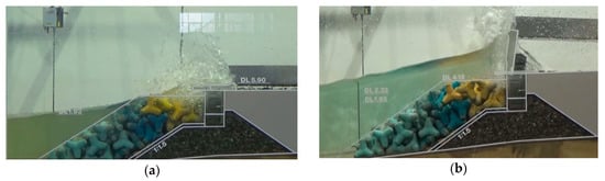 Figure 7 shows photographs taken when the water surface elevation was at its maximum, and Table 3 shows the results of the measured overtopping discharge. Figure 7a shows that a large amount of water is overtopped, even though the return period is 10 years. The allowable overtopping discharge is 0.01 m3/(m s) for areas crowded by private houses and public facilities in the hinterland, where serious disasters are expected because of the inflow of overtopped water and sprays [22]. The overtopping discharge at a full scale is 0.03 m3/(m s), as shown in Table 2. The result of this case is greater than the allowable limit, despite the minimum value among the test cases for the non-standing barrier. Thus, for this case, the movable barrier must stand to prevent wave overtopping. As shown in Figure 7b, two bullnoses on the movable barrier were designed to efficiently reflect the incident waves to the seaside. Although stairs perform this role well, the overtopped water can still be seen because of the large incident wave condition. However, the overtopping discharge at a full scale is 0.0099 m3/(m s), which is less than the allowable limit. The developed movable barrier properly prevents wave overtopping for the designed wave with a 50-year return period.