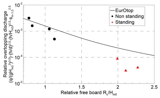 Figure 9 shows the relative overtopping discharge with respect to the relative free board. Based on the relative free board, the standing barrier is compared with Equation (6), and the non-standing barrier is compared with Equation (7). For the non-standing barrier, overtopping discharges are less than the results of the EurOtop, except for the minimum relative free board (which is the case for the 50-year return period and the sea level during the storm surge with the SLR in Table 4) because the wave energy is reduced by armor units, and the vertical wall has a short overhang that minimally blocks wave overtopping. However, the overtopping discharge is about 1.2 times greater than the predicted results at the minimum relative free board, presumably because the wave energy is not reduced by the armor units because of high incident wave conditions. For the standing barrier, the overtopping discharges are less than those of EurOtop, since incident waves are returned to the seaside by two bullnoses. To secure the right view, the height of the standing movable barrier should be decreased. Thus, the height of the bullnose should be increased and the number of the bullnose should be increased to reduce wave overtopping.