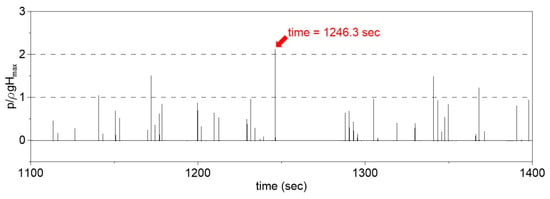 Figure 10 shows the result of the uplift pressure at p4 in Figure 5a for the 10-year return period and the approx. H.H.W. (No. 1, Table 2). The y-axis is the uplift pressure nondimensionalized by the hydrostatic wave pressure for the maximum wave height, Hmax. The maximum wave height is 19.5 cm. The total generation time is 30 min. This figure shows results in the range around the maximum pressure. Relative uplift pressures greater than 1 occur about 20 times during the total generation time. The maximum relative uplift pressure is 2.12, as shown in Figure 10. This means that the impulsive pressure acts on the bottom of the movable barrier. The impulsive pressure is inversely proportional to its duration. The impulsive pressure becomes especially higher when the incident wave height increases, and the distance between the water surface and the horizontal structure (i.e., non-standing barrier) decreases. If the weight of the movable barrier is increased to secure the barrier’s stability, additional ground reinforcements on the target site may be needed. However, adding such reinforcements is difficult and costly work. To ensure stability, three options are possible: (1) The movable barrier could be installed closer to the landside to avoid impulsive pressure from acting on the bottom of the non-standing barrier; (2) the distance between the water surface and the non-standing barrier could be increased; (3) the number of armor units could be increased at the seaside to reduce the wave’s energy.