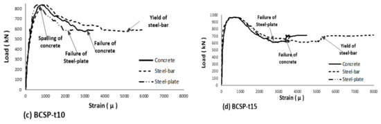 The steel plate of the BCSP beam also yielded (the design has adopted no buckling). The concrete on the surface was not damaged during the failure load for the BCSP beams, which is unlike the CB. Indeed, for the BCSP-10 and BCSP-15 beams, the cross section remained much more intact and was able to maintain a high load level after the peak load. Thus, the over-reinforced beams with normal strength concrete displayed three types of failure modes. The first was the crushing of the concrete cover with mid-span compression, as seen in the CB. The second was the initial spalling of the concrete cover and crushing underneath the loading points. Also, extension of the shear cracks and an increase of crack width within the span were observed in the BCSP-6 and BCSP-10 beams. The third mode, the most typical mode, was flexural failure, which was observed in the BCSP-15 beam.
