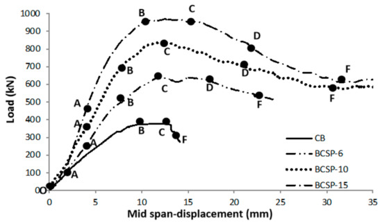 For the BCSP beams, it was observed that the majority of cracks continued to extend gradually as the applied load increased. Additional cracks were observed on the concrete cover of the BCSP-6 beam from the two sides of the points of load application. The beams exhibited a form of pseudo ductility, or reserve capacity, in being able to withstand additional loads. The concrete cover began to crack at higher loads, and the initial cracks were identified at the compression zones under the two loading points. The frequency of the formation of additional cracks then decreased. The beam remained ductile, with a slight decrease in load, until total failure occurred without crushing in compression at the middle zone. This prevented the brittle failure of the BCSP-6 beam, an event that was shared with the CB. Here, Figure 5b illustrates the failure mode.
