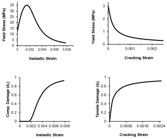 The values of the dilation angle, eccentricity, fb0/fc0, K, and the viscosity parameter were chosen as the default for the CDP models, which were 35, 0.1, 1.16, 0.667, and 0.01, respectively [43,44,45] Table 8 offers a summary of the mechanical properties of the concrete. Other parameters that relate to the compressive and tensile strengths are shown in Figure 9.