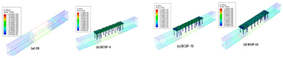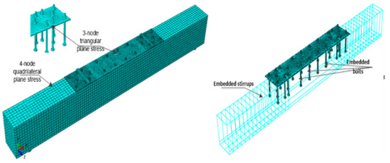 Figure 10 shows the rebar and bolts that were embedded in the concrete in the interactive model while assigning the concrete as the host. Thus, the rotations and translations of the reinforcing bar and bolt elements were equal to those of the host elements surrounding them (i.e., a perfect bond) [46,47,48,49]. The bond between the steel plate and concrete surface was modelled using the two materials’ cohesive behavior. The node coupled method was used to model the bolts, whereas the nodes of the steel reinforcing bar and the steel plate were coupled (Figure 2 details this reinforcement). Figure 1 shows the boundary conditions of the simply-supported beam. All beams were subjected to flexural loading after the modelling was completed, and the results of the entire analysis were investigated.