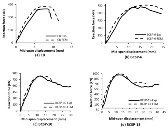 The mean load ratios of the experimental to FE peak loads were 0.87%, 0.86%, 1.01% and 0.98%. Also, the average deflection ratios of the experimental to FE deflection at peak load were 1.09%, 0.79%, 0.69% and 1.2% for the CB, BCSP-6, BCSP-10, and BCSP-15 beam specimens, respectively, as shown in Table 10.