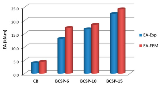 - Based on comparisons between the experimental and FE analysis of the curves’ mid-span displacement under load, EA, and crack patterns with varying failure modes, it can be concluded that the proposed model is in accordance with the test results. Therefore, FE models used here can be used for further investigation.