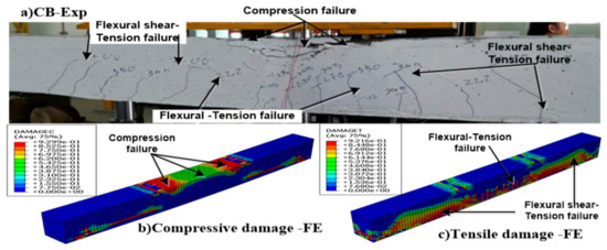 The concrete cover began to crack at higher loads, and the initial cracks were identified at the compression zone, causing the concrete cover to spall off in compression at the region of the maximum bending moment. This mode of failure is referred to as the crushing of concrete in the compression zone. This type of failure is illustrated in Figure 5a, which shows the brittle failure of the CB.