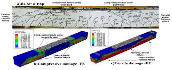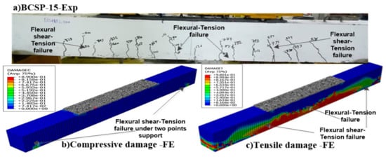The design recommendations of the ACI-code and CSA [28,36], which depend on stress-strain diagrams, were used to calculate the nominal load capacities (Pn). The ratios of the normal load (Pn) to the spalling load of the experimental (PSpall,EXP) beam specimens were 0.99%, 0.98%, and 1%. Those equal to the ratio of the normal load to the spalling load of the FE (Pn/PSpall,FE) were 0.89%, 1.03%, and 1.06%. Those equal to the ratio of the spalling load of the experimental to the spalling load of the FE (Pspall,EXP/Pspall,FE) were 1.11%, 0.95%, and 0.94% for the CB, BCSP-6, and BCSP-10 beam specimens, respectively, while the BCSP-15 beam specimen experienced flexural failure, as shown in Table 11. The finite element analysis gave accurate values of Pspall for all of the beams. Both the experimental and predicted results were in very good agreement. Also, the load-deflection curve from the experiment was in agreement with the FE analysis. The results indicate that the constitutive models of this study can be used to accurately predict the behavior of over-reinforced concrete with steel plates without buckling failure.