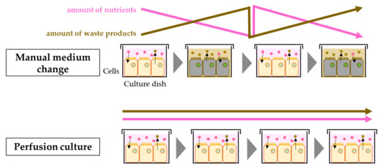 Ordinarily, it is necessary to regularly replace the culture medium when cultivating cells. Currently, this method of cell culture, known as manual medium change, is widely used [9]. Manual medium change is a method that involves completely removing the culture medium and replacing it with new media. However, in manual medium change, it is easy for waste products to accumulate and for nutrients to be replenished, which may cause cell stress owing to conditions such as acidosis, which lowers the quality of the cells [10]. Additionally, the culture medium is replaced manually within a biosafety cabinet outside the incubator, which exposes the culture to the external environment. In this way, manual medium change involves large changes in the conditions of the culture environment that may differ greatly from those in the in vivo environment in a way that is detrimental to the cells (Figure 1).
