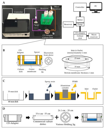 System overview and CD-Adapter. (A) Overview of the perfusion culture system developed in this study. (B) Dimension of the CD-Adapter. The size of the culturing area is adjusted by a spacer (green colored). The tight sealing is realized by the holding jig (blue colored), which presses the surface of the CD-Adapter against the dish wall. Deformation of the center membrane of the CD-Adapter is also prevented by the holding jig. (C) Fabrication process of the CD-Adapter. CD-Adapter is made by polydimethylsiloxane (PDMS) molding. The mold master is made of epoxy resin. The center membrane was formed by aluminum cylinder (gray colored). (D) Adaptation of the CD-Adapter to various 35 mm culture dishes. By adjusting the holding jig, the PDMS CD-Adapter is expanded and contracted, and the CD-Adapter can adapt to 35 mm culture dishes of different sizes.