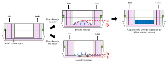 In this study, a holding jig was attached not only for the tight sealing, but also for maintaining the shape of the CD-Adapter. Actually, an unintended deformation of the center membrane caused by a slight change in pressure could disrupt the stable culture environment, as a uniform flow cannot be maintained in the culture dish. Therefore, we devised a technique to prevent the deformation using an acrylic holing jig. The holding jig was placed on the center membrane, as shown in Figure 3, functioning to restrain the membrane. To demonstrate the efficacy of the holding jig, the difference between lines a and b of Figure 3 was measured as an indicator of deformation.