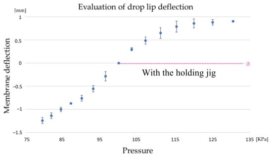Evaluation result of the pressure and the deflection of the center membrane. The deflection is defined as 0 at atmospheric pressure (100 kPa). Dotted line “a” is the deflection of the membrane with the holding jig.