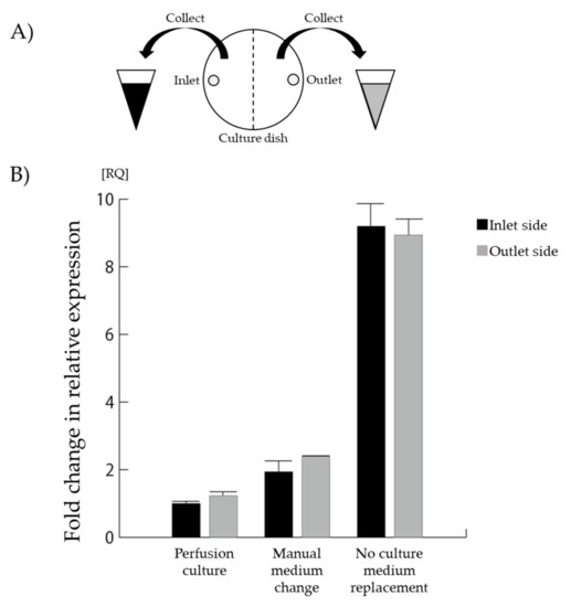 Gene expression analysis results. (A) Cell collection area on a culture dish. Cells cultured under each condition were collected from two halves of the culture dish: the inlet side and the outlet side. (B) Gene expression values of DDIT3 by 293T cells cultured for three days. The three experimental conditions are as follows: perfusion culturing with the system, culturing by manual medium change, and culturing without medium exchange. Each value was obtained by qRT-PCR. CD-Adapters were applied to all dishes to standardize the shape of the culture container.