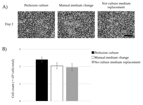 The expression of the stress marker DDIT3 by 293T cells cultured under perfusion, manual medium change, and no medium replacement conditions is presented in Figure 5B. The results reveal that, in perfusion culture, the relative expression levels were 1.00 on the inlet side and 1.23 on the outlet side. Similarly, the relative expression levels for manual medium change were 1.94 and 2.40, respectively, and those for no culture replacement conditions were 9.20 and 8.94, respectively. Compared with the results of the perfusion condition, the no culture replacement condition and the manual medium change condition showed an approximate nine-fold and two-fold increase in DDIT3 expression, respectively, indicating that perfusion culture reduced the amount of stress on cells compared with conventional manual medium change. Furthermore, we demonstrated that, under all the examined conditions, DDIT3 expression was almost equal in cells growing on the inlet and outlet sides. In perfusion culture using the system described in this paper, we showed that the cell culture environment was uniform throughout the culture dish. In addition, cell growth was evaluated for differences in each culture condition. After three days of culture, cells reached confluence, so the cell number after two days was counted. As shown in Figure 6, there was no difference in cell proliferation rate and morphology owing to differences in culture methods. After two days of culture, there was no significant difference in cell number, so there was no device advantage for cell growth at this stage. At 1.4 µL/min set in the experiment, we assume that the pressure was hardly applied because the medium did not leak from the CD-Adapter even when the tube was removed from the CD-Adapter.