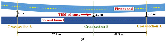 In order to ensure that the numerical modelling is as close as possible to an actual excavation process, the modeling tunnel length should be sufficiently large in case that condition permitted [26,27]. In the proposed model, an approximate length of 153 m in the tunneling direction is adopted, as shown in Figure 3a. After the excavation of the first tunnel is finished, the second tunnel sequentially passes through the cross-sections A, B, and C (Figure 3b). Taking Cross-section B as the measured cross-section, the positions at the middle, left and right sides of the twin tunnels are respectively marked as the monitoring axes MP, LP and RP in its lateral view (Figure 3c).