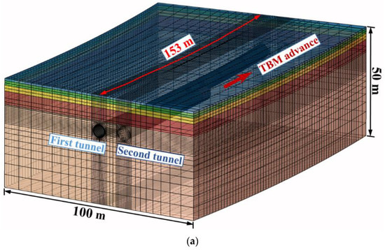 The TBM shield is assumed as a cylindrical shape with conicity ignored [29]. Due to the presence of the cutter-head as well as chamber, the elastic modulus and thickness of the shield in the models are 10 and 2 times greater than those in Table 2, respectively [30]. Nevertheless, the elastic modulus of the segments needs to be reduced due to the simulations of longitudinal or circumferential joints are ignored. Consequently, the modulus of the concrete segments is assumed as 25.9 GPa in the case of the reduction factor of 0.75 [30].