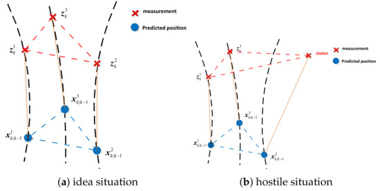 The likelihood in Equation (27) is widely used for data association, it performs well under the assumption that actual motion model of target is coincident with the preset dynamic motion model. In some practical applications, however, this assumption does not hold.