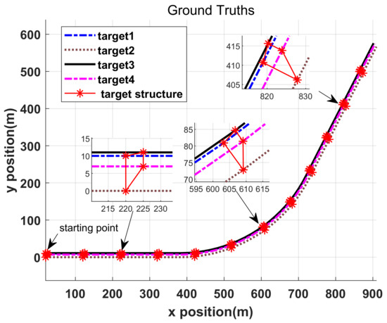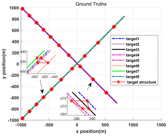 In many scenarios, targets travel in group, such as a group of airplanes moving in formation and the scattering centers on a 2D rigid target [27,28]. The scattering centers on a 2D rigid target share common motions and maintain relative order in certain time range [29], these scattering centers can be considered as group of targets, each target in group is almost rigidly positioned with respect to each other, thus the structure information of these scattering centers can be used to enhance tracking performance. For example, the states of undetected targets can be inferred through other detected targets. Although the structure information is beneficial to MTT, the targets in group are treated independently in JPDA filter, MHT, LMB, etc. In these filters, the measurement is associated with the closest target ’s state, the reason is that the smallest distance corresponds to the highest likelihood under the assumption that these targets share common motion. Therefore, incorrect data association results can be obtained when actual motion model is not coincided with the preset dynamic motion model. In this paper, the structure information are used to enhance the tracking performance of rigid targets.