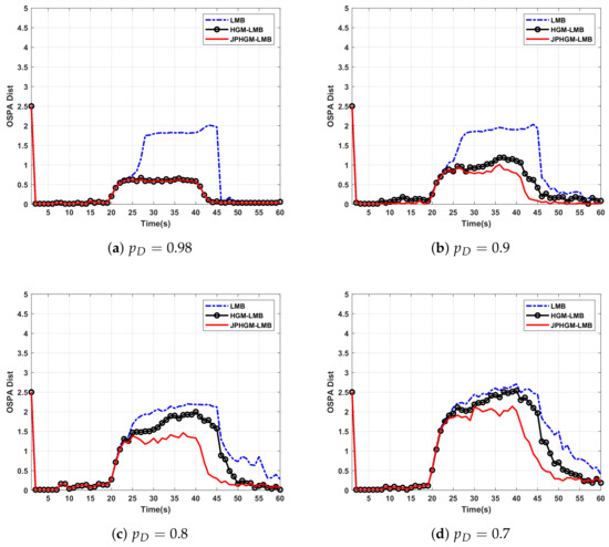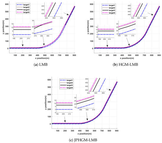 In order to test the superiority of the proposed approach, LMB, HGM-LMB and JPHGM-LMB are applied to track these four targets with detection probability , the obtained trajectories by these three filters are shown in Figure 3. From Figure 3, it can be seen that the trajectories of these filters are almost identical to the true trajectory during the intervals 0 s–20 s and 40 s–60 s. However, the trajectories of LMB cross each other a lot and that of other filters are maintained correctly during the interval 20 s–40 s. The reason is that the actual motion model does not coincide with the transition motion model during 20 s–40 s. Therefore, measurements generated by one target may not appear near this target, the data association may produce a wrong association result in LMB. However, structure information facilitates HGM-LMB and JPHGM-LMB to produce more accurate trajectories. HGM-LMB and JPHGM-LMB achieve similar performance with high detection probability, HGM-LMB and JPHGM-LMB maintain correct trajectories as shown in Figure 3b,c.