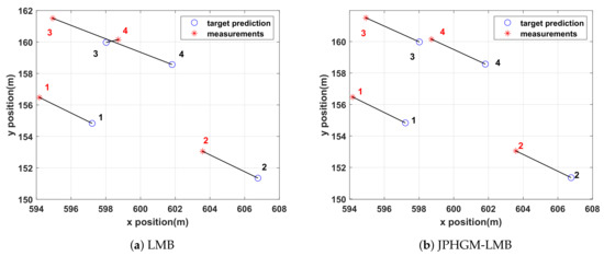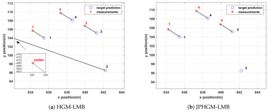 From Figure 5, we can see that target 2 is not detected and the clutter is associated with target 2 in HGM-LMB since HGM-LMB is built based on the assumption that there is no missed detection. Therefore, the clutter is considered as a valid measurement and associated with target 2. However, target 2 can be identified as the undetected target in JPHGM-LMB, then better association performance can be achieved.