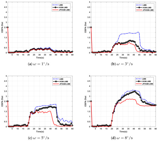 The OSPA of these filters with different turning rate and are shown in Figure 7. From Figure 7, we can see that turning rate has significant effect on the performance of targets tracking, the tracking performance degrades a lot as the turning rate increases. Highly unreliable estimates are obtained with larger turning rate and appear in the OSPA curve. The larger the turning rate is, the more serious the model mismatch is. As mentioned above, the estimation accuracy of target states degrades even if the data association is correct when model is mismatched. If one target is undetected at one moment, there is no measurement available to update its prediction state which is obtained through preset dynamic motion model. Because of the model mismatch, the state estimates of this target will be far away from the true state, the more serious model mismatch is, the worse target state estimation is, the target may be eliminated if target state estimation is worse enough, then the targets cardinality will be underestimated. The structure of targets is destroyed in some degree, the state estimates of this target can converge to true state again after several time steps if it is detected, then the structure of targets can be recovered. The more time is needed with larger turning rate. If missed detection occurs again before the structure is restored, the structure of targets may be destroyed permanent, the poor performance of JPHGM-LMB and HGM-LMB will be achieved.