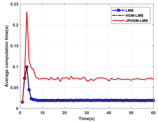 The average computation time for tracking these four targets of three filter with is shown in Figure 8. As mentioned in Section 3, JPHGM-LMB follows some idea of JPDA, it suffers the problem of JPDA more or less, the number of association events grows exponentially with the number of targets. The better tracking performance is achieved at the sacrifice of computation time.