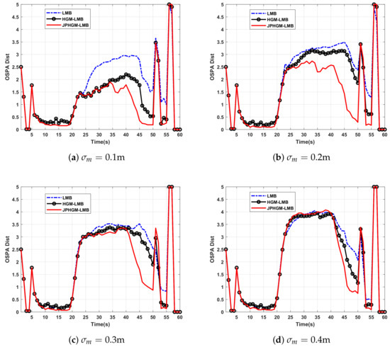 From Figure 10, when targets maneuvering during the interval 20 s–40 s, the OSPA of three filters increases, the reason is the mismatch between actual motion model and dynamic motion model. When targets born or die, the number of targets will change, these filters will take some time to obtain the true number of targets, then the OSPA distance increase. The performance of JPHGM-LMB degrades with increasing measurement error and these filters achieves almost similar performance when . However, JPHGM-LMB outperforms other filters, because JPHGM-LMB takes both kinematic and structure information into account and missed detections are considered. In JPHGM-LMB, the hypergraph is introduced to represent the structure of predictions and measurements, then the problem of data association can be formulated as a hypergraph matching problem, it becomes more challenge to obtain the correct matching results as measurement errors increases. Moreover, the structure of targets will be deformed because unreliable measurements are used to update the states of targets. From Table 3, JPHGM-LMB achieves larger MOTA values than other filters, it means that JPHGM-LMB obtains higher quality trajectories than other filters, it further validates the superiority of JPHGM-LMB.