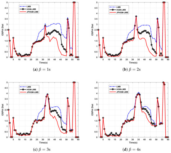 When occlusion happened, there are two aspects. Firstly, the number of targets will be underestimated, filters take several time steps to obtain the true cardinality estimation. There is no measurement available to update prediction state of occluded target, the estimation error of occluded target can not be avoided because of the model mismatch and measurement noise, the OSPA distance increases as shown in Figure 11. However, the superiority of JPHGM-LMB can be found clearly in Table 4, JPHGM-LMB always achieves larger MOTA than other filters as occlusion duration increases. Secondly, the structure of targets is broken to some extent when occlusion happened, the structure can be recovered if occlusion duration is short, then the structure information can also enhance the tracking performance, see Figure 11a,b. However, if occlusion duration is long enough, then the structure of targets may be destroyed permanent, the performance of HGM-LMB and JPHGM-LMB will degrade, see Figure 11c,d.