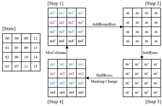 Masking is a countermeasure against the CPA performed by randomizing the power consumption unrelated to the guessable intermediate value. The Boolean masking conceals sensitive data x by XORing a random value (mask) m to the data . Thus, the intermediate value x is split into more than two random variables . The analyst cannot disclose the key via the CPA because the intermediate value, which is related to power consumption, is not guessable. Typically, the 8-bit masked AES is implemented as a schema proposed by Herbst [7]. As the schema can efficiently resist the first-order CPA (FOCPA) with only six masks. Figure 1 shows the mask used to conceal the output of each transformation in the Herbst schema. Note that SubBytes and Shiftrows require only one mask each, and MixColumns requires four masks.