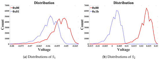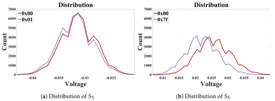 Figure 5 shows the distribution of power consumption of and . The difference between the means of the two distributions of is approximately 0.003485, which is about 6.8 times larger than that of (0.000512). This is very close to the theoretical ratio of 7. The t-value of and is 107.73 and 24.81, respectively. Consequently, the effect of noise can be relatively reduced, as stated in Property 3.