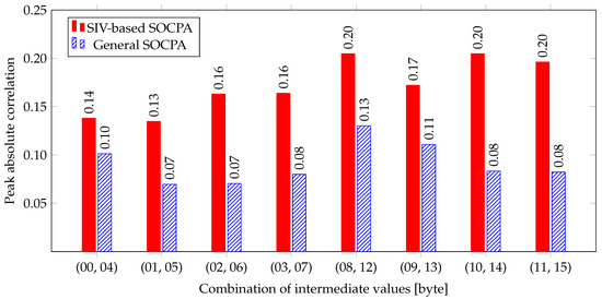 Figure 6 shows the bytewise peak correlation of two versions of the SOCPA. The correlation of the SIV-based SOCPA for every combination is higher than that of the General SOCPA, and the average correlation of the SIV-based SOCPA is approximately 1.7 times higher than the General SOCPA. The correlation of the SIV-based SOCPA is not 1.00 because the remaining 24 bits behave similar to noise.