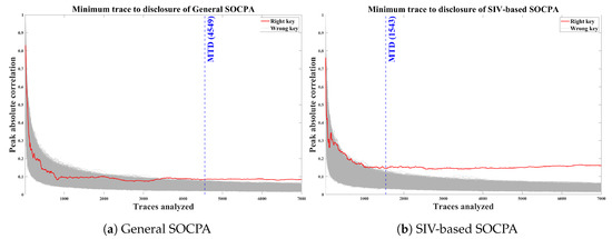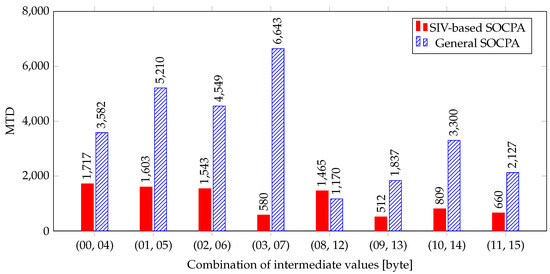 Figure 8 shows the MTD of every combination of intermediate values; the maximum MTD of the SIV-based SOCPA is 1717, and that of the General SOCPA is 6643. Therefore, SIV allows the disclosure of the entire secret key using only a quarter of the trace required by the General SOCPA.