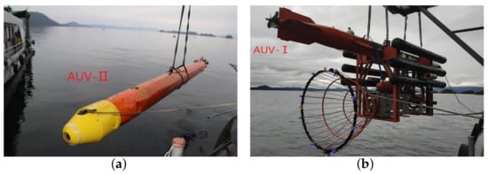 In this section, we introduce an AUV and a mobile recovery system, which are illustrated in Figure 1. The MRS includes an AUV (is called AUV-I) and a docking station. The docking station was rigidly fixed to the underbelly of AUV-I. The entrance of the docking station was a funnel-like, 2 m in diameter. The AUV to be recovered is called AUV-. AUV- was a torpedo-shaped vehicle that was 384 mm in diameter and 5486 mm in length. It was equipped with a GPS, an inertial measurement unit (IMU), a Doppler velocity log (DVL) and an acoustic sensor. The acoustic sensor, Evologics 32C R, was used for long-range positioning. The AUV-I carries a transponder, and AUV- carries transceiver. The application scenario is: The MRS is moved with constant velocity and travels in a straight path, the AUV chases MRS to complete the homing process. The line-of-sight guidance algorithm is used to guide AUV to MRS.