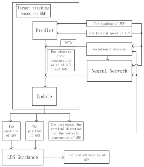 The AUV estimates the states of AUV and MRS based on TT-EKF with its own heading and forward speed. To estimate the PNCM, we model the heading and forward speed of AUV and MRS, and calculate the parameters of these distributions. The neural network is applied to compensate the prediction error. The framework of our proposed algorithm is shown in Figure 2.