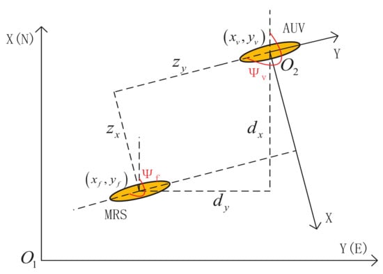 In Figure 3, and are the position and heading of AUV, respectively. and are the position and heading of MRS, respectively. is the global North, East coordinate frame, is the local AUV coordinate frame. The measurement at time index k can be expressed as: . and are the horizontal and vertical direction of the measurement components in local coordinate system. and are the horizontal and vertical direction of relative distance components between the AUV and MRS in global coordinate frame. The system state Cartesian coordinates is defined as follow: