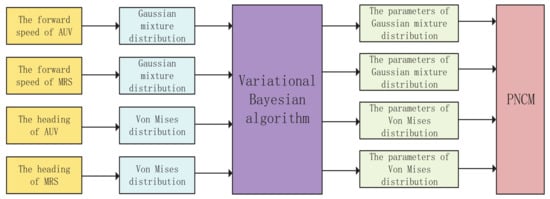 The forward speed of AUV is non-Gaussian due to the non-Gaussian process noise. The heading angle is a periodic variable. The probability distribution of forward speed and heading is modeled in Section 5.1. The parameter estimation of probability distribution of forward speed and heading is calculated in Section 5.2. The PNCM is estimated in Section 5.3. The framework of the algorithm proposed in this section is shown in Figure 5: