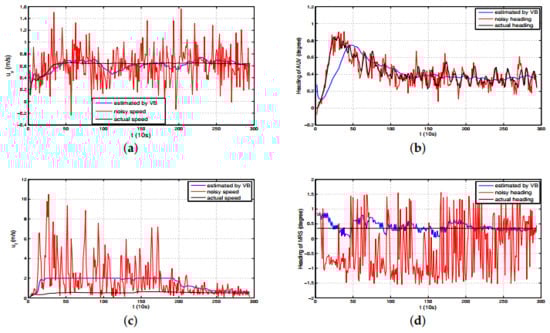 In this simulation, the real positions of AUV and MRS are calculated using the complicated motion model. The deviation between the real position and estimated position is positioning error. (a) and (b) in Figure 7 are the horizontal and vertical direction of the positioning error components of AUV with different algorithm. (c) and (d) in Figure 7 are the horizontal and vertical direction of the positioning error components of MRS with different algorithm. In these figures, the blue line show the positioning error of the TT-EKF with the PNCM . It should be pointed out that the components of ( and ) is the real noise statistics. The red lines show the positioning error of the TT-EKF with the PNCM . The PNCM is totally inaccurate. The green lines show the positioning error of the TT-EKF with the PNCM is estimated by VB algorithm. The black lines show the positioning error of the TT-EKF with the PNCM is estimated by VB algorithm and the odometric error is compensated by BP neural network. The estimated heading and forward speed of AUV and MRS are shown in Figure 8 based on TT-EKF with the PNCM is estimated by VB algorithm and the prediction error is compensated by BP neural network. In (a) and (b), the red lines are noisy forward speed and heading of AUV, respectively; The black lines are actual forward speed and heading of AUV, respectively; The blue lines are the estimated forward speed and heading of AUV based on VB algorithm, respectively. In (c) and (d), the red lines are noisy forward speed and heading of MRS, respectively; The black lines are actual forward speed and heading of MRS, respectively; The blue lines are the estimated forward speed and heading of MRS based on VB algorithm, respectively. The Figure 9 illustrates the real trajectory of AUV and MRS and estimated trajectory based on adaptive TT-EKF. To compare the positioning performance of the algorithm under various conditions, Table 3 and Table 4 list the real position and estimated position of the AUV and MRS at some moments.