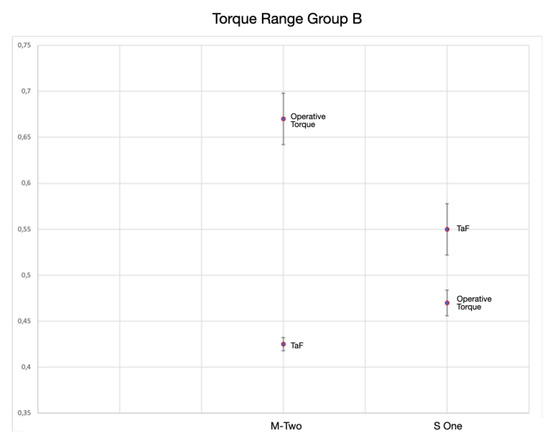 Two torque ranges were analyzed. One was calculated by subtracting the mean values of TaF and operative torque from group A. The second was calculated by subtracting group B mean values of TaF and operative torque.
