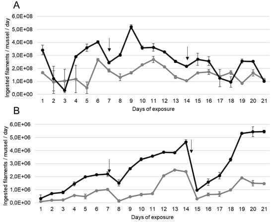 Mean ± S.E.M number of filaments of P. agardhii ingested per day by (A) A. anatina and (B) D. polymorpha, during exposure to a density of filaments producing an equivalent of 10 µg (grey lines) and 100 µg (black lines) MC/L, n = 2 aquariums. Days for which the water was completely renewed are indicated with an arrow.