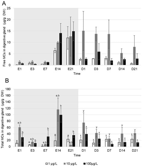 Mean ± S.E.M concentrations (µg/g DW) of (A) free and (B) total MC accumulated in the digestive glands of A. anatina exposed to P. agardhii producing an equivalent of 1 (white), 10 (grey) and 100 (black) µg MC/L, during the exposure (days with the letter E, grey background) and the depuration (days with the letter D, white background), n = 3 pools of 6 individuals. No significant difference between concentrations of the same sampling time (Kruskal–Wallis test, p > 0.05). Letters indicate difference in MC accumulation (Kruskal–Wallis, p < 0.05) between exposure concentration series during the exposure (a and b), and the depuration (x and y).