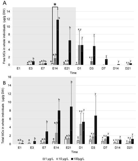 Mean ± S.E.M concentrations (µg/g DW) of (A) free and (B) total MC accumulated in whole D. polymorpha exposed P. agardhii producing an equivalent of 1 (white), 10 (grey) and 100 (black) µg MC/L, during the exposure (days with the letter E, grey background) and the depuration (days with the letter D, white background), n = 3 pools of 6 individuals. * Indicates a significant difference between concentrations at the same time (Kruskal–Wallis test, p < 0.05). Letters indicate difference in MC accumulation (Kruskal–Wallis, p < 0.05) between exposure concentration series during the exposure (a and b), and the depuration (x and y).