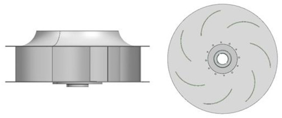 - Lee, J.; Jeon, H.; Jang, C. Performance characteristics according to the outlet impeller blade shape of a centrifugal blower. KSFM J. Fluid Mach. 2013, 16, 12–18. [Google Scholar] [CrossRef]